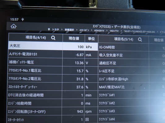 問診後に試運転をしスキャンツールを接続し、エンジンライブデータを確認。