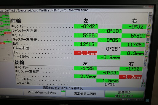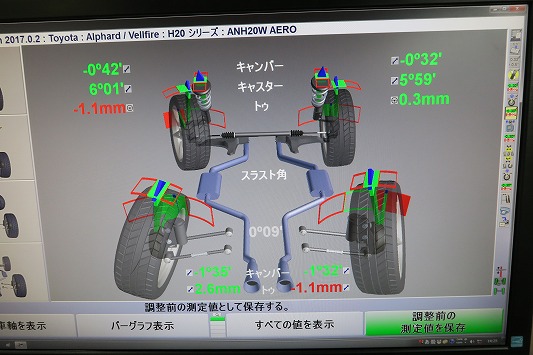 リア側の数値はアクスルビームブッシュ破損とアクスルビームの歪みで、数値が悪化していますね。