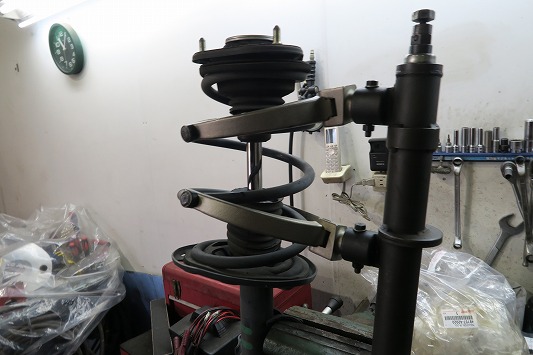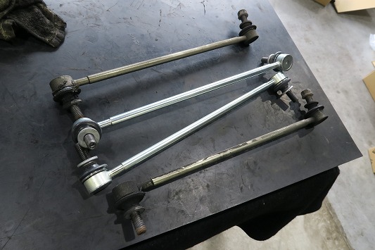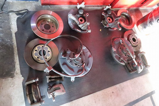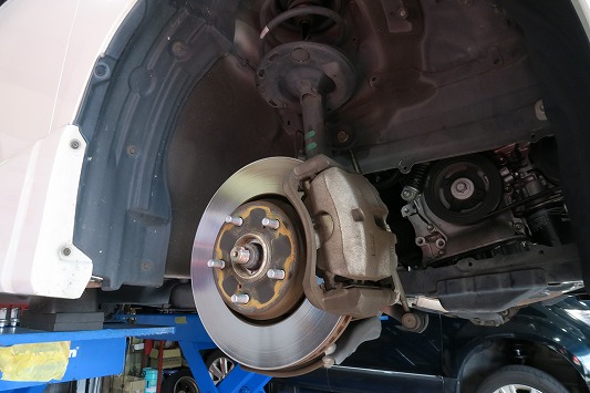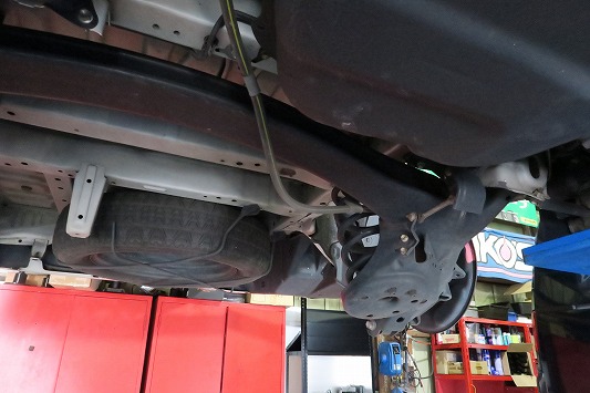 ・整備リフトでリフトアップ。 タイヤを外して足回り下回りを点検。