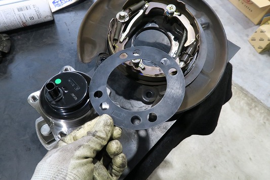 ブレーキバックプレートとアクスルビームの間に(SPC トヨタ リアシム)を