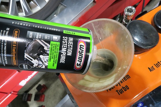 燃料タンクのガソリンを遮断し、マルチサーブから専用ケミカル剤を圧送してインジェクター洗浄。