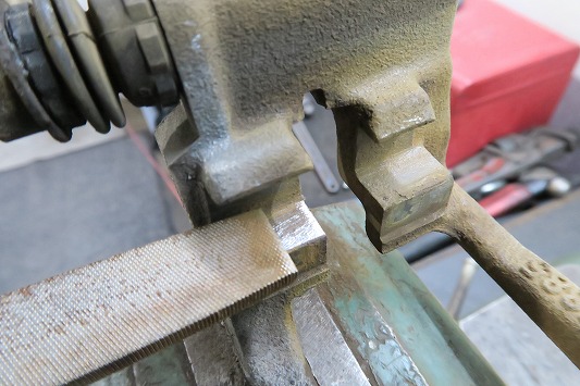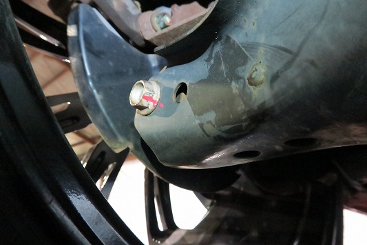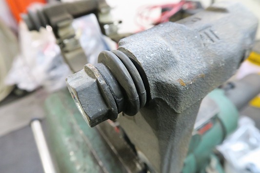 車体への組付け前にブレーキパットと座金とのクリアランスを確認して、スムーズにブレーキパットが収まるように調整しました。